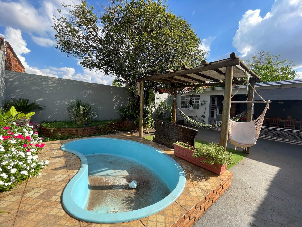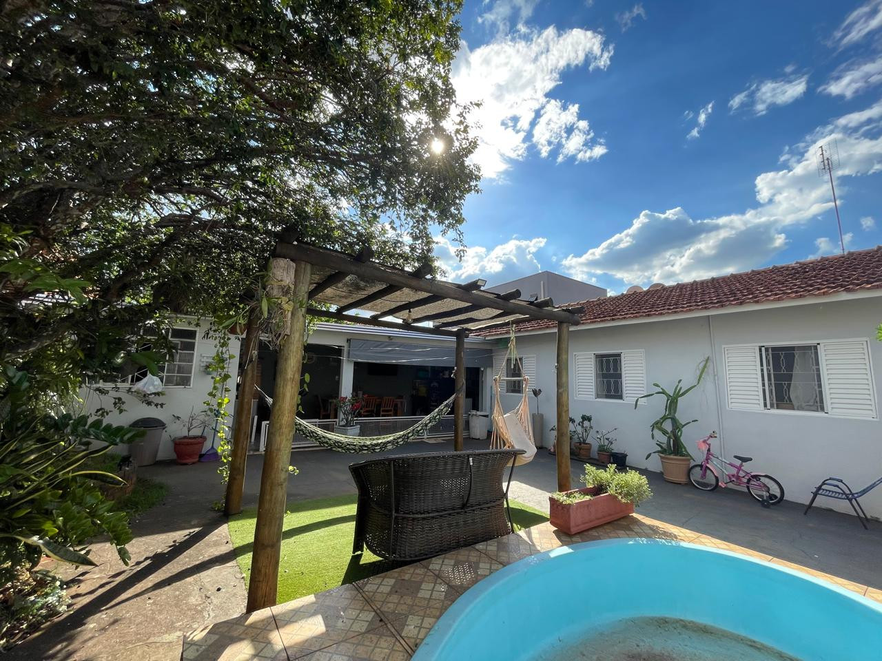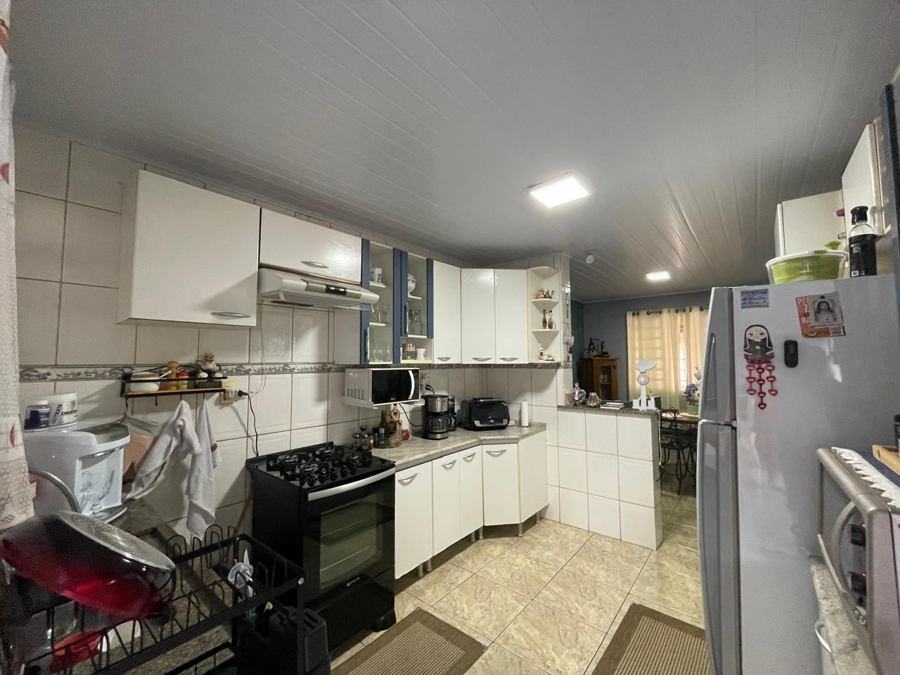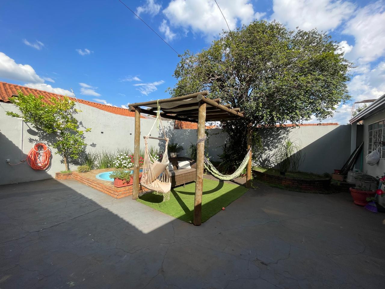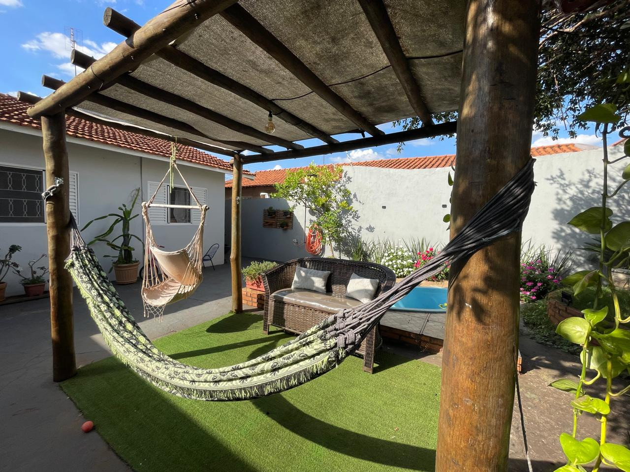 Residência beneficiada com 03 dormitórios (sendo 01 suíte), sala de TV, sala de estar, banheiro social, cozinha com armários, copa, área de churrasco, lavanderia, pequena piscina, pergolado, garagem com portão eletrônico e interfone.