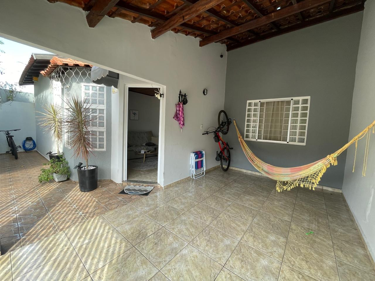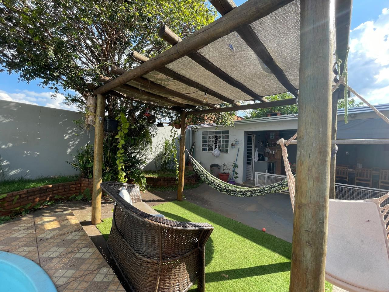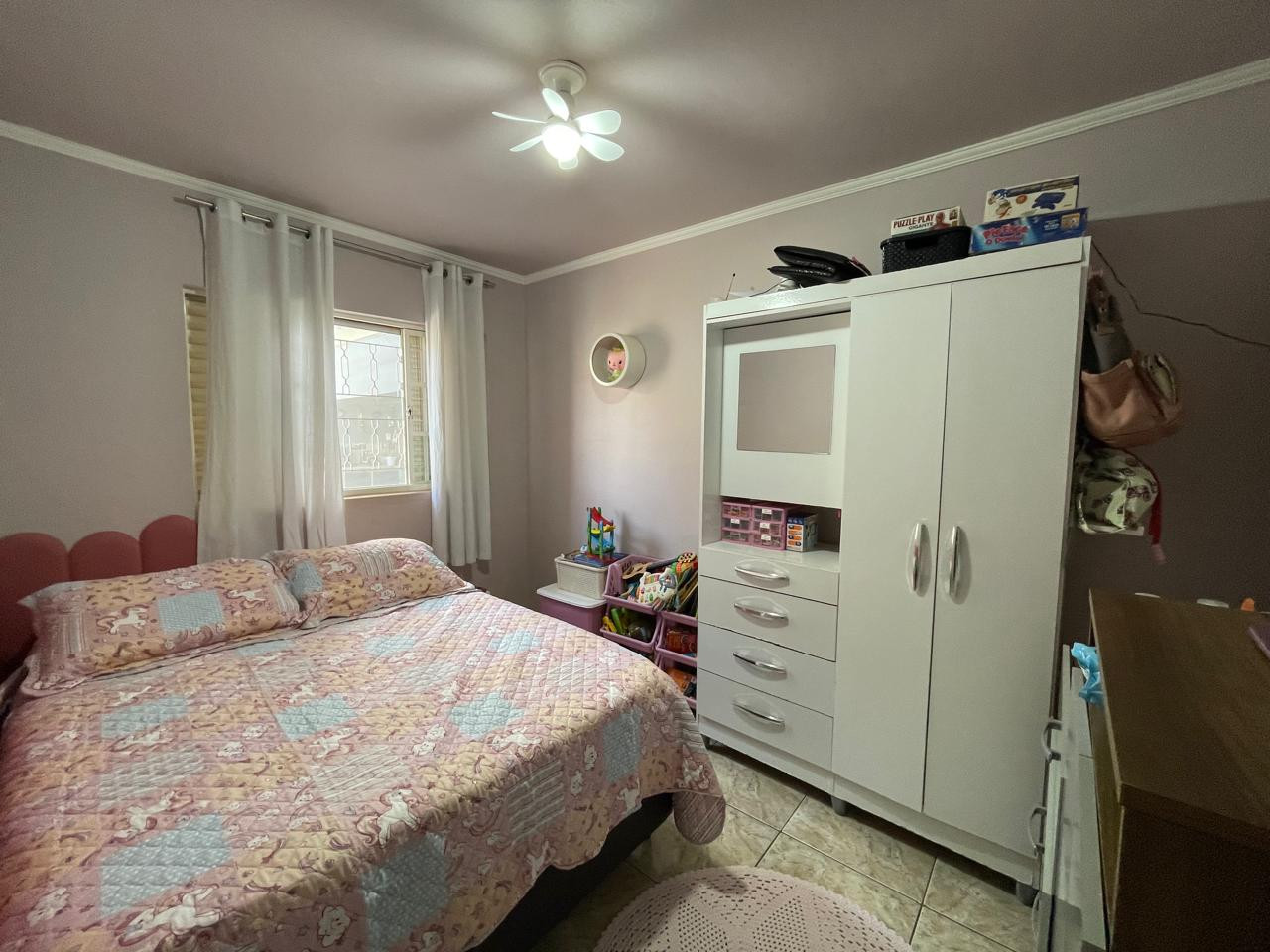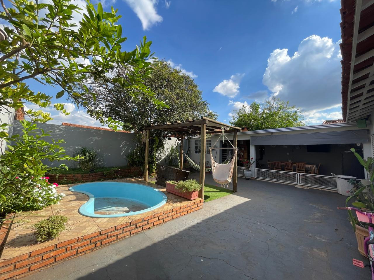 Residência beneficiada com 03 dormitórios (sendo 01 suíte), sala de TV, sala de estar, banheiro social, cozinha com armários, copa, área de churrasco, lavanderia, pequena piscina, pergolado, garagem com portão eletrônico e interfone.