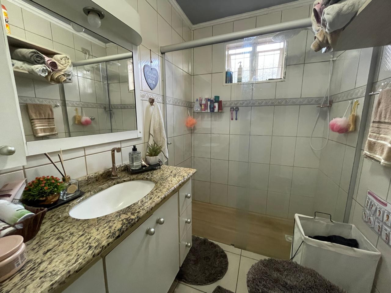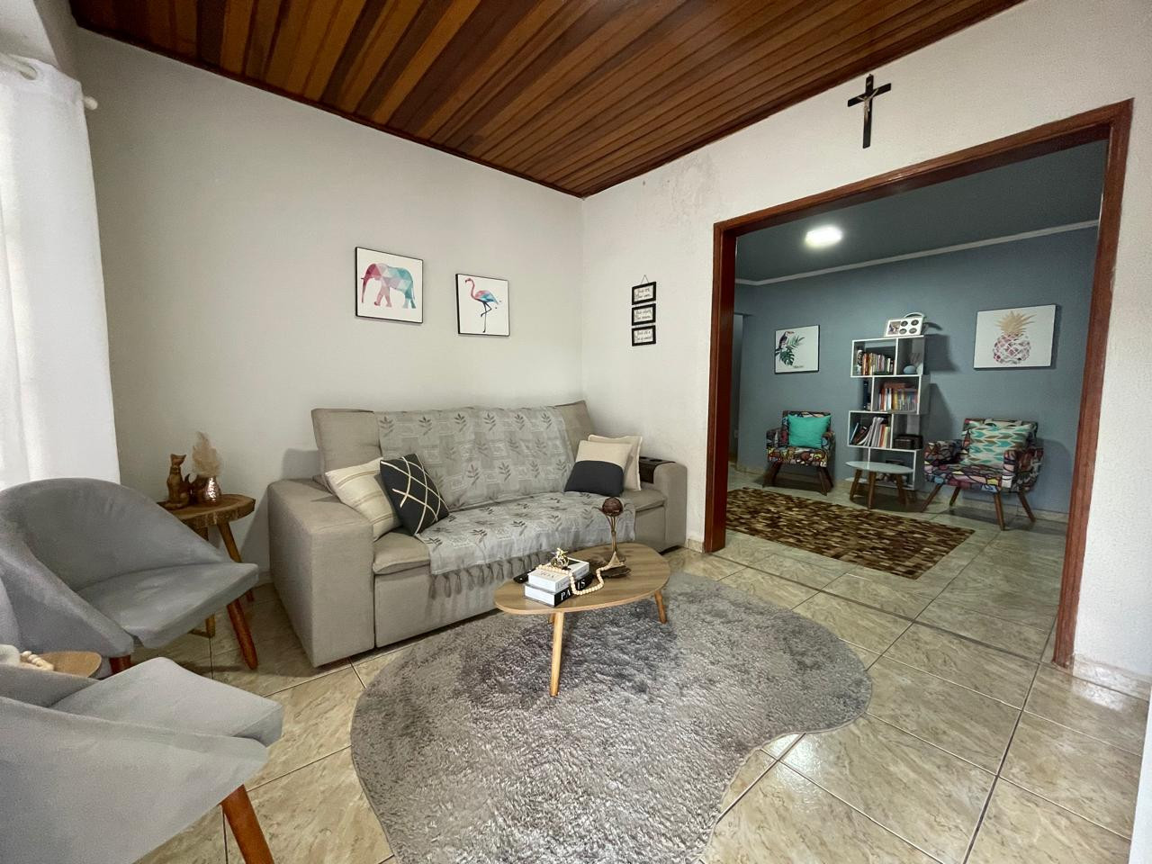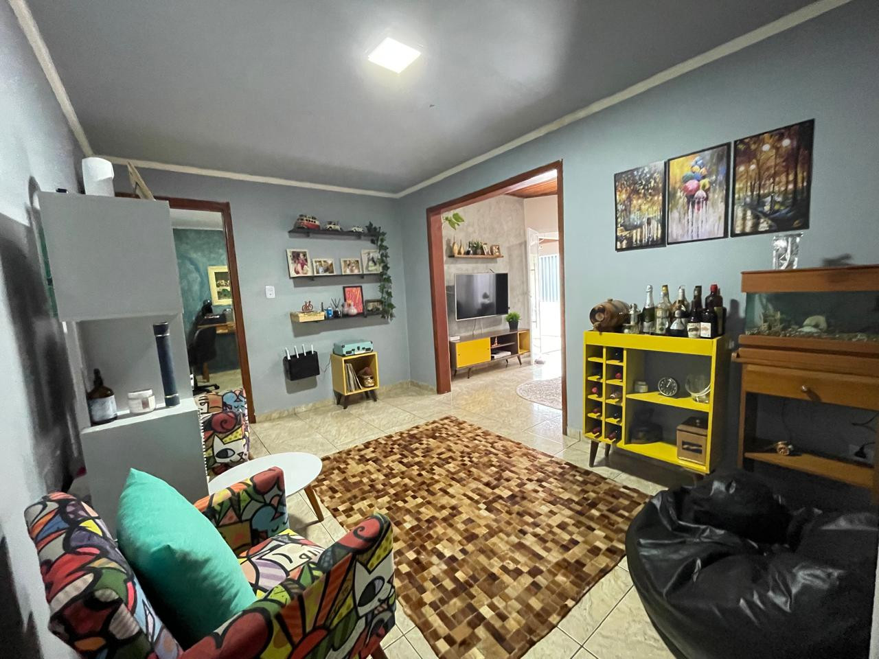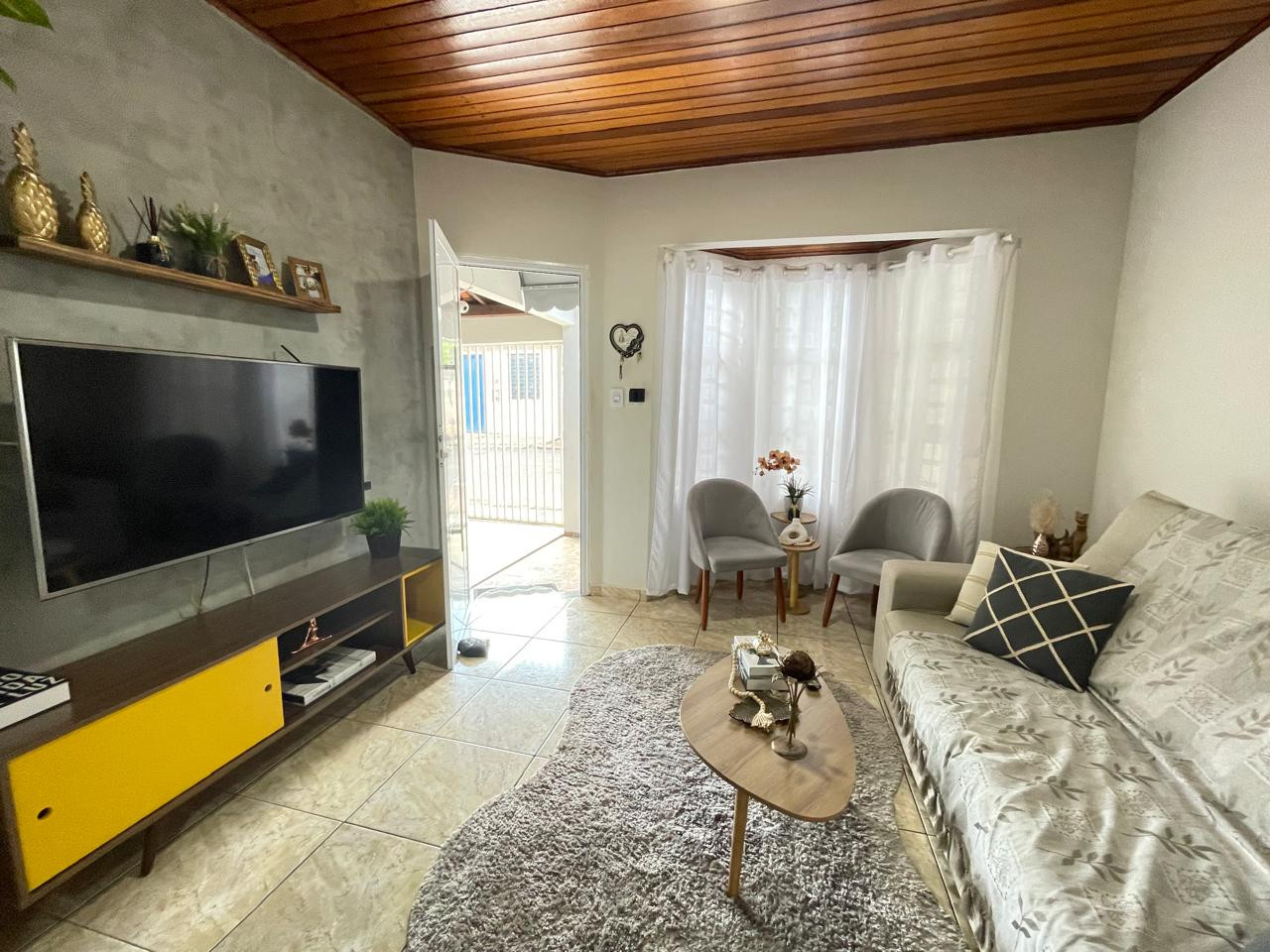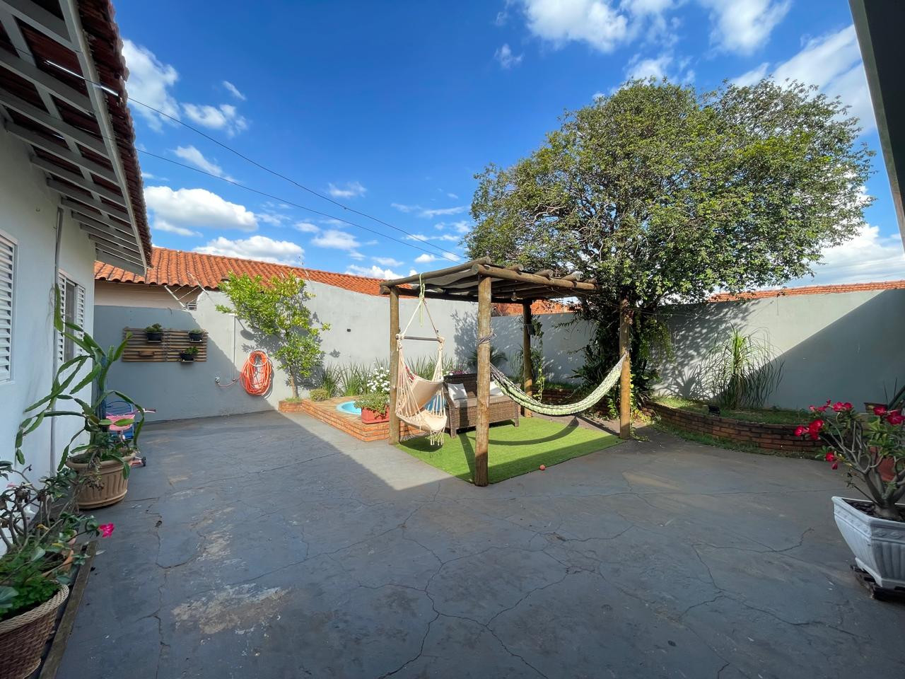 Residência beneficiada com 03 dormitórios (sendo 01 suíte), sala de TV, sala de estar, banheiro social, cozinha com armários, copa, área de churrasco, lavanderia, pequena piscina, pergolado, garagem com portão eletrônico e interfone.